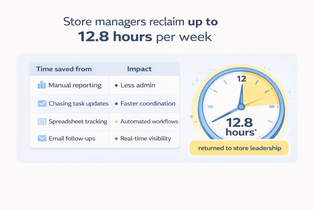 When store operations are digitized the way managers actually work, the impact is immediate. Managers can reclaim up to 12.8 hours per week previously lost to administrative coordination, time that can be reinvested in coaching teams, supporting customers, and running a store with confidence.